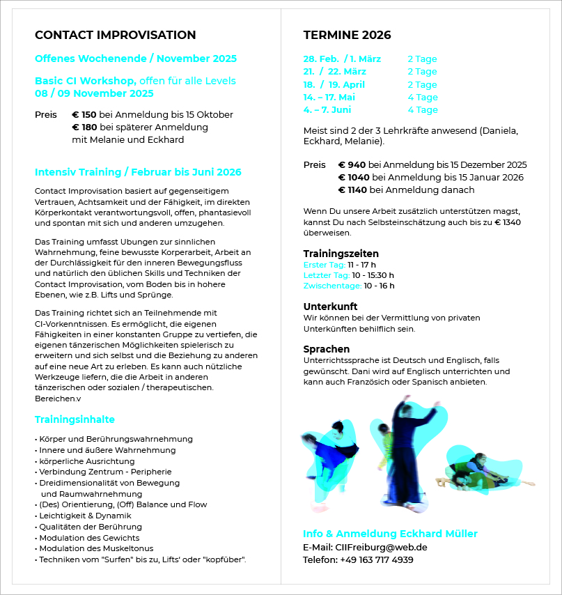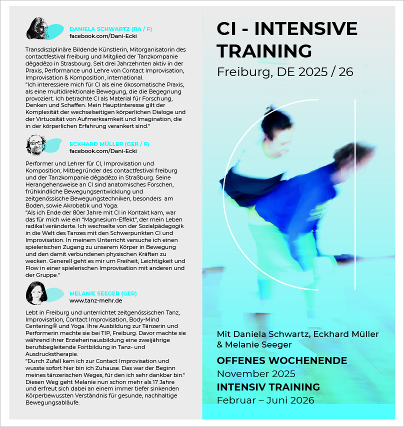 Liebe CI Freunde Für alle, die tiefer in den CI Tanz einsteigen wollen bieten wir ein CI Intensive Training von 5 Modulen in der Zeit von Februar bis Juni 2026 in Freiburg an. Deadline for early bird bis 15. January. Mehr info im Anhang Eine gute Entscheidung im Neuen Jahr für Dich Selbst. lieben Gruß Dani, Ecki, und Meli -- eckhard mueller www.dani-ecki.com www.contactfestival.de www.ciglobalcalendar.net