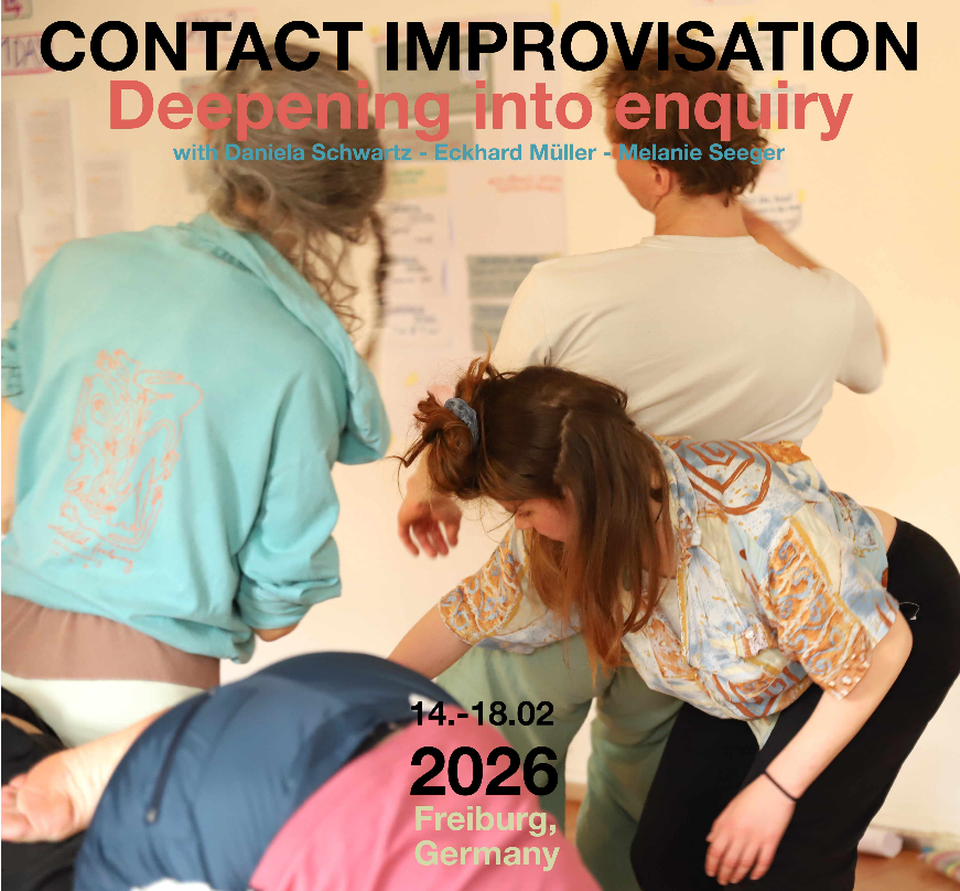 * Liebe CI Enthusiasten, die sich tiefer in die Materie geben wollen: Der early bird price für unsere CI Enquiry Woche im Februar gilt nur noch bis 10. Dezember. Könnte ja ein schönes Weihnachtsgeschenk für Dich selbst sein. lieben Gruß Ecki und Team CONTACT IMPROVISATION / DEEPENING INTO ENQUIRY Facilitated by Daniela Schwartz - Eckhard Müller - Melanie Seeger Join us and those passionate dancers about CI enquiry and development, for a week of exploration, labs, try outs. A space/time to share and exchange around and about deepening into the practice of teaching and/or facilitating Contact Improvisation. We will propose diverse formats for accessing your interests and questions, we will bring bibliography to dance with and to questions or (re)formulate concepts, as well scores and formats for Jamming and researching CI. You will benefit from a stable group of motivated movers committed to further develop and share their practice and knowledge within a group. Dates 14 - 18 February 2026 *Place * Freiburg im Breisgau, Germany. Time First day: 11 - 17 hLast day: 10 - 15:30 hDays in between: 10 - 16 h Price 430 euros till Dec 10th 2025. 480 euros after. Accommodation:We can help arrange accommodation Language:English. We also speak german, french and spanish. Info & registration: Eckhard Müller: cittfreiburg@gmail.com ; phone: +49 163 717 4939 greetings the CI Teacher Training team Freiburg Dani, Ecki & Meli TEAM Daniela Schwartz (F/RA) Nomadic artist, involved in the practice, performance and teaching of Contact Improvisation and Improvisation since 1998. She travels throughout EU and the Americas giving workshops in various institutional and private contexts. In Alsace, her base of action, she is a member of Co. Dégadézo since 2005. She is co-organizer and co-artistic director of contactfestival freiburg in Germany since 2012. She was part of the conception, organization and conduction team of the 1st ISS Improvisation Summer School in collaboration with the Université Côte d'Azur, France 2019. With a focus on the ecosomatic practices as multidirectional movements in the present moment and as material for research, thought and creation, my main interests are the complexity of the interrelational dialague and the virtuosity of attention and imagination anchored in the physical experience. Eckhard Müller (GER/F) Performer and teacher for Contact Improvisation & Improvisation, co-founder of the contactfestival freiburg and the dance company degadezo in Strasbourg. Further areas of experience in Somatics, contemporary movement techniques, acrobatics and yoga. I am teaching CI and Improvisation since the early 90ies worldwide. These techniques are also the foundation for my SKIN Interactive Performance Concept project, that I have realized in many cities all over South America and Europe with my partner Dani. My main objective is to find to a mutual communication with our partner. In my lessons I try to awaken a playful approach to our bodies in motion, the associated physical forces and touch. In general, I am interested in freedom, lightness and flow in the meeting with our partner and the group. Melanie Seeger (GER) www.tanz-mehr.de Lives and works in Freiburg as a freelance dancer and dance teacher. She gives regular courses in new dance, improvisation, contact improvisation (CI) and Vinyasa yoga. Together with Eckhard Müller and Bernd Ka, Melanie teaches the advanced CI training program by Bewegungs-art Freiburg. Apart from her teaching activities, Melanie performs in various stage projects. She did a two-year training in dance and expression therapy at Wendpunkt and graduated as dancer and performer at TIP (school for dance, improvisation and performance) in Freiburg. Currently she is undergoing Body Mind Centering® training to become somatic movement educator (SME). Melanie first discovered her love for dance when she was in her early 20s. Since then she has been intensively researching various contemporary dance forms and techniques, enjoying going deeper into body-aware understanding of healthy, sustainable movement. * CI TT _1 week deepening_medium.jpg -- eckhard mueller www.dani-ecki.com www.contactfestival.de www.ciglobalcalendar.net